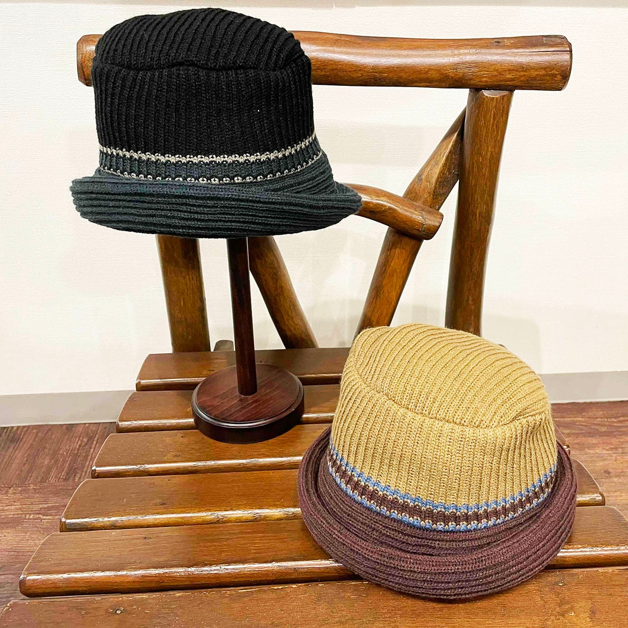 ライン入りのニットバケットハットです。