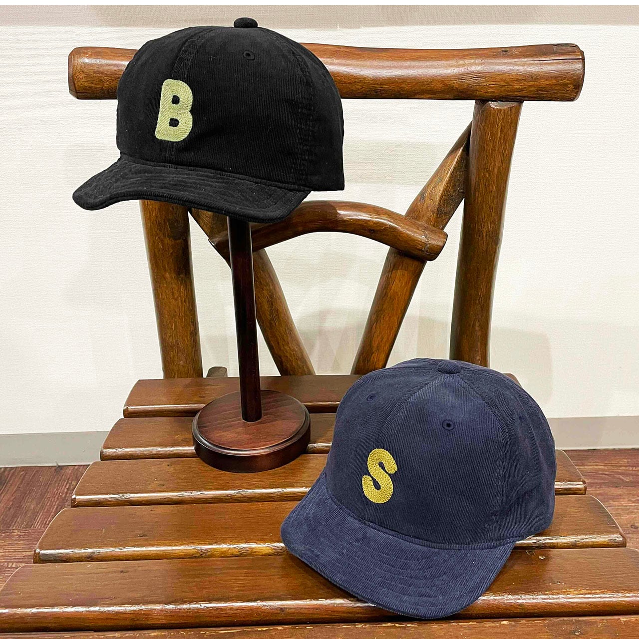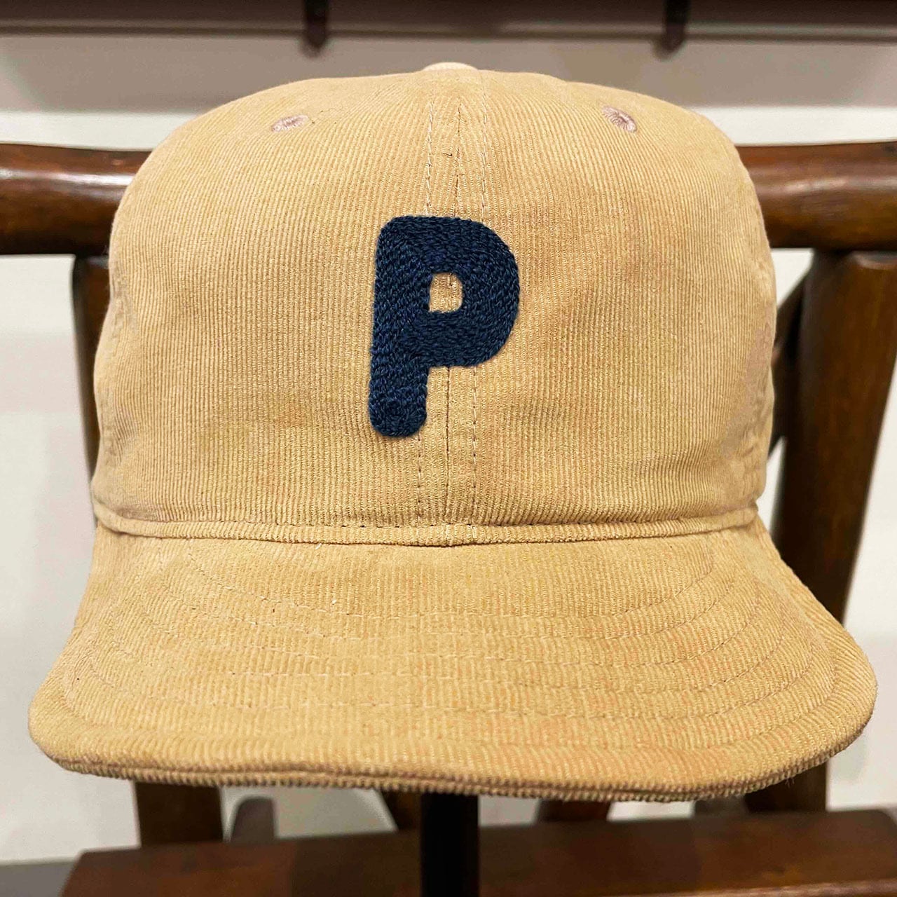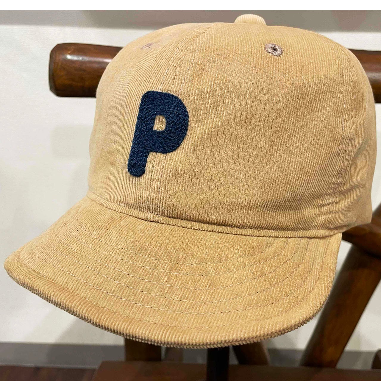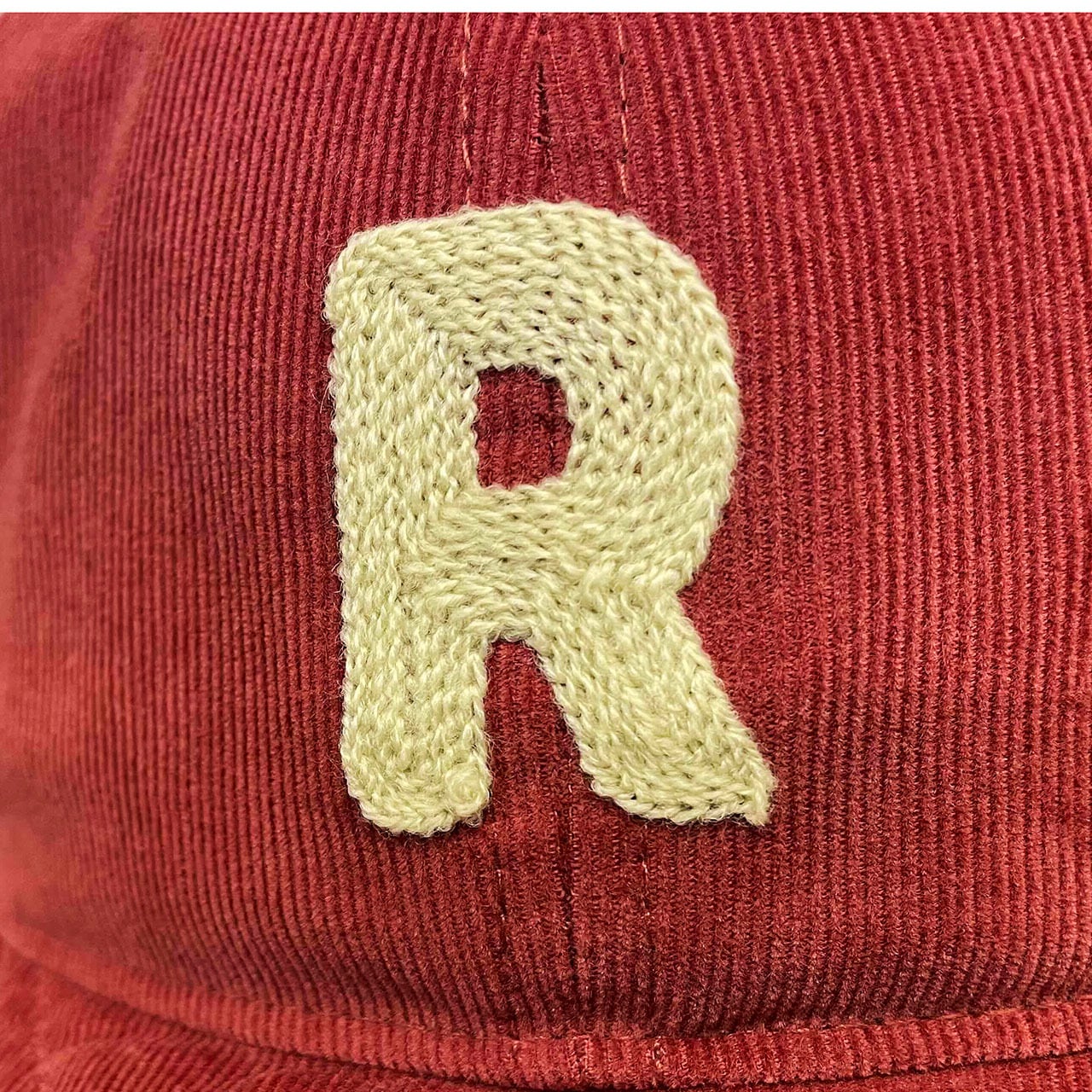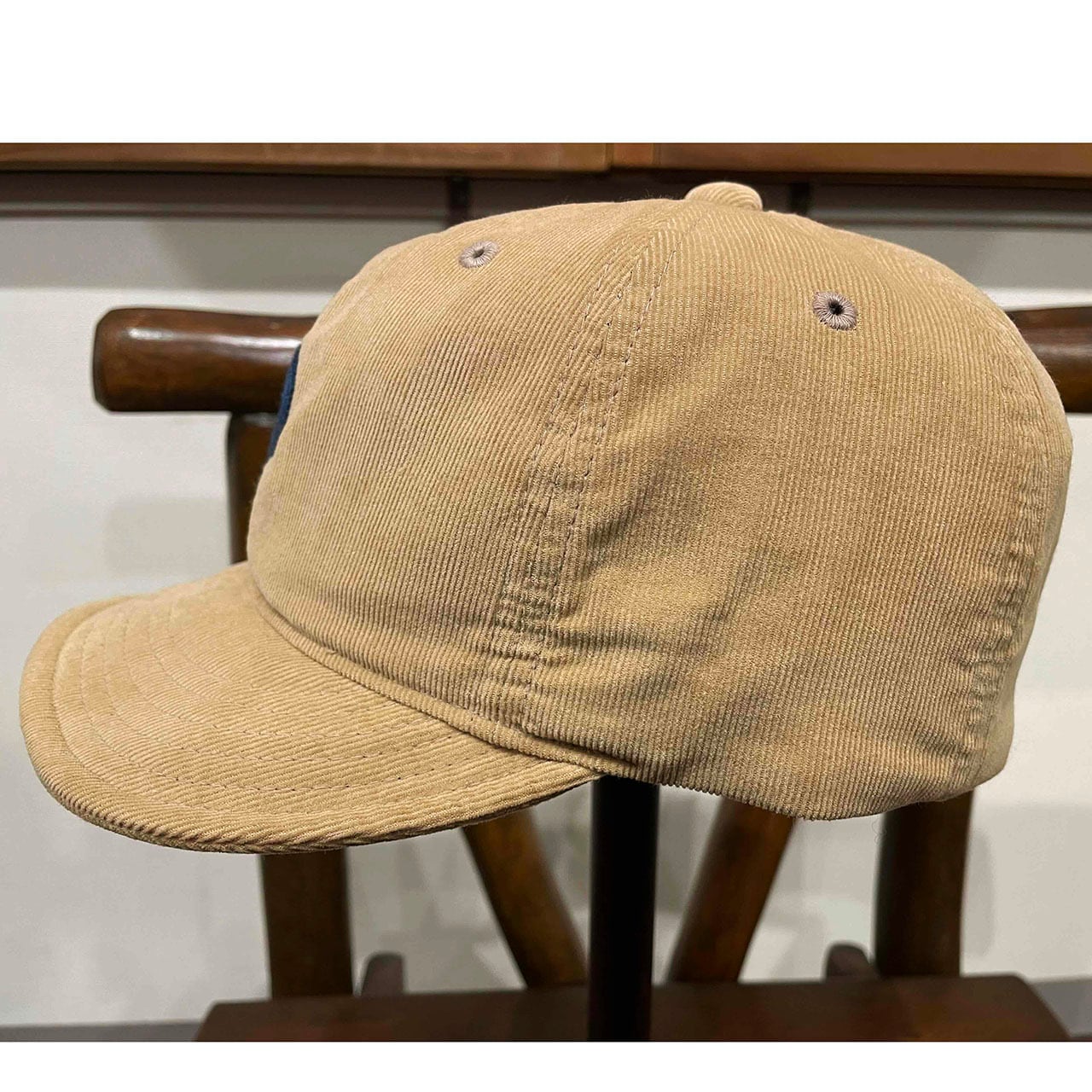 チェーン刺繍のロゴが入ったコーディロイ素材のショートつばキャップ。