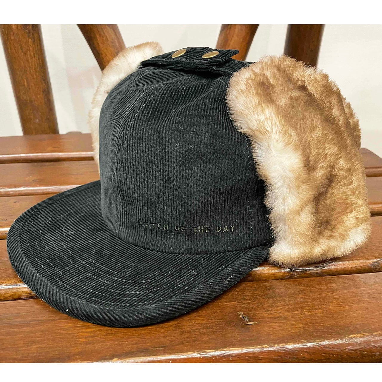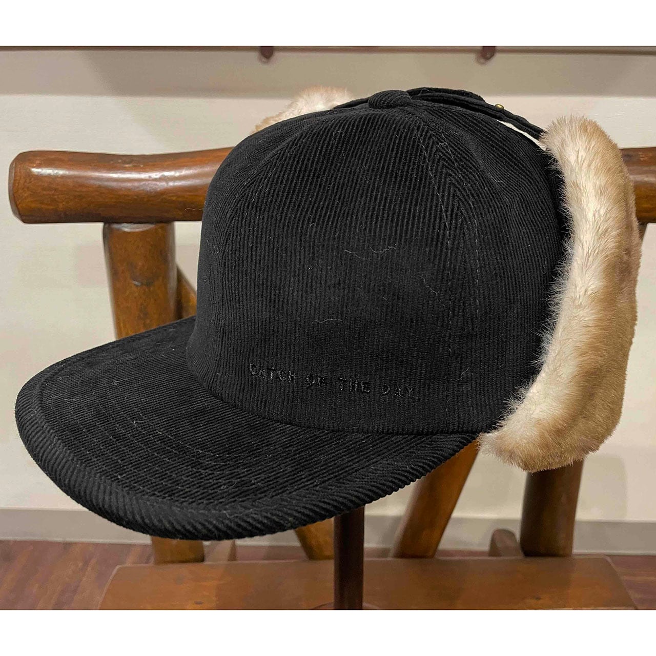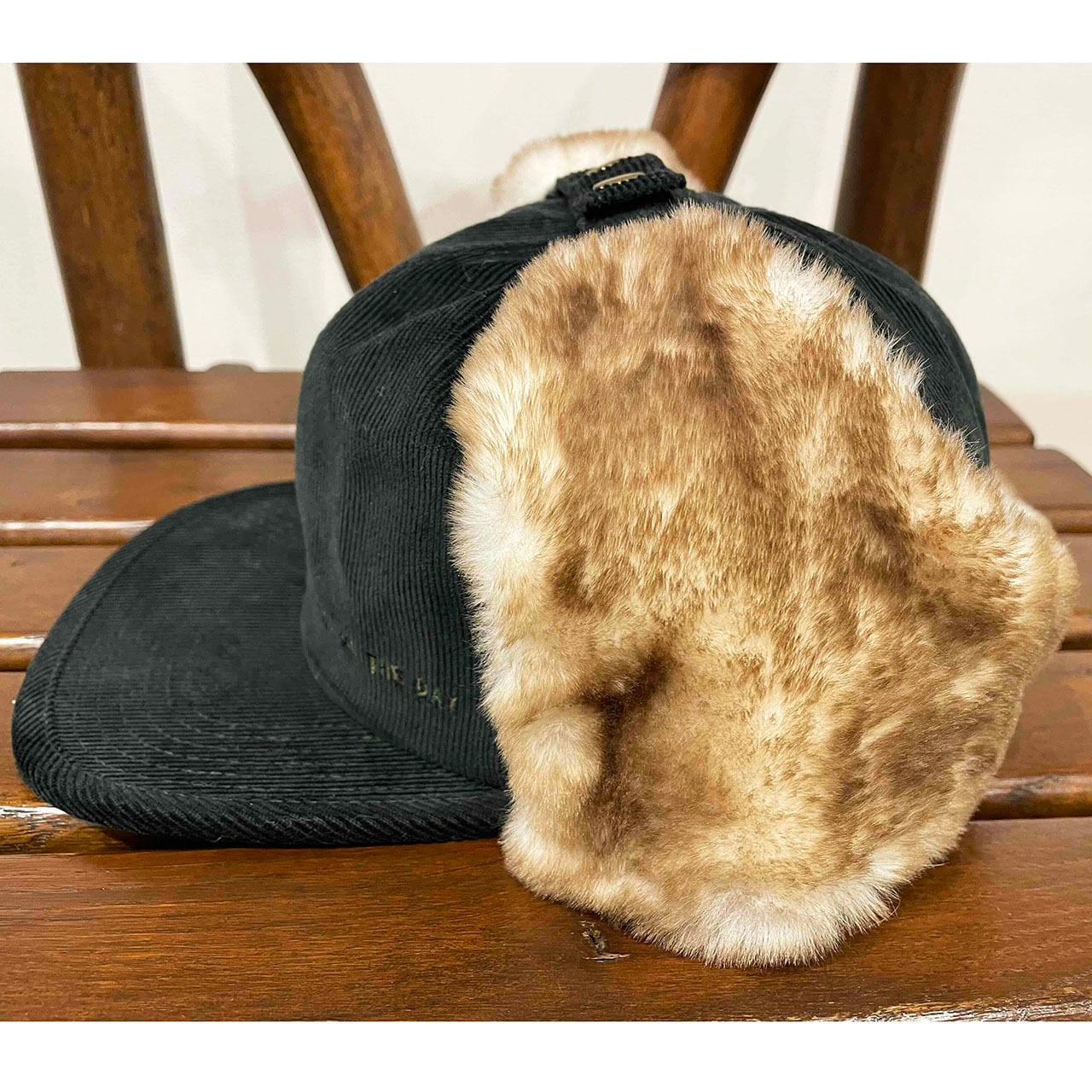 毛足を吹き付けた斑のあるファーを使用したフラップキャップ。