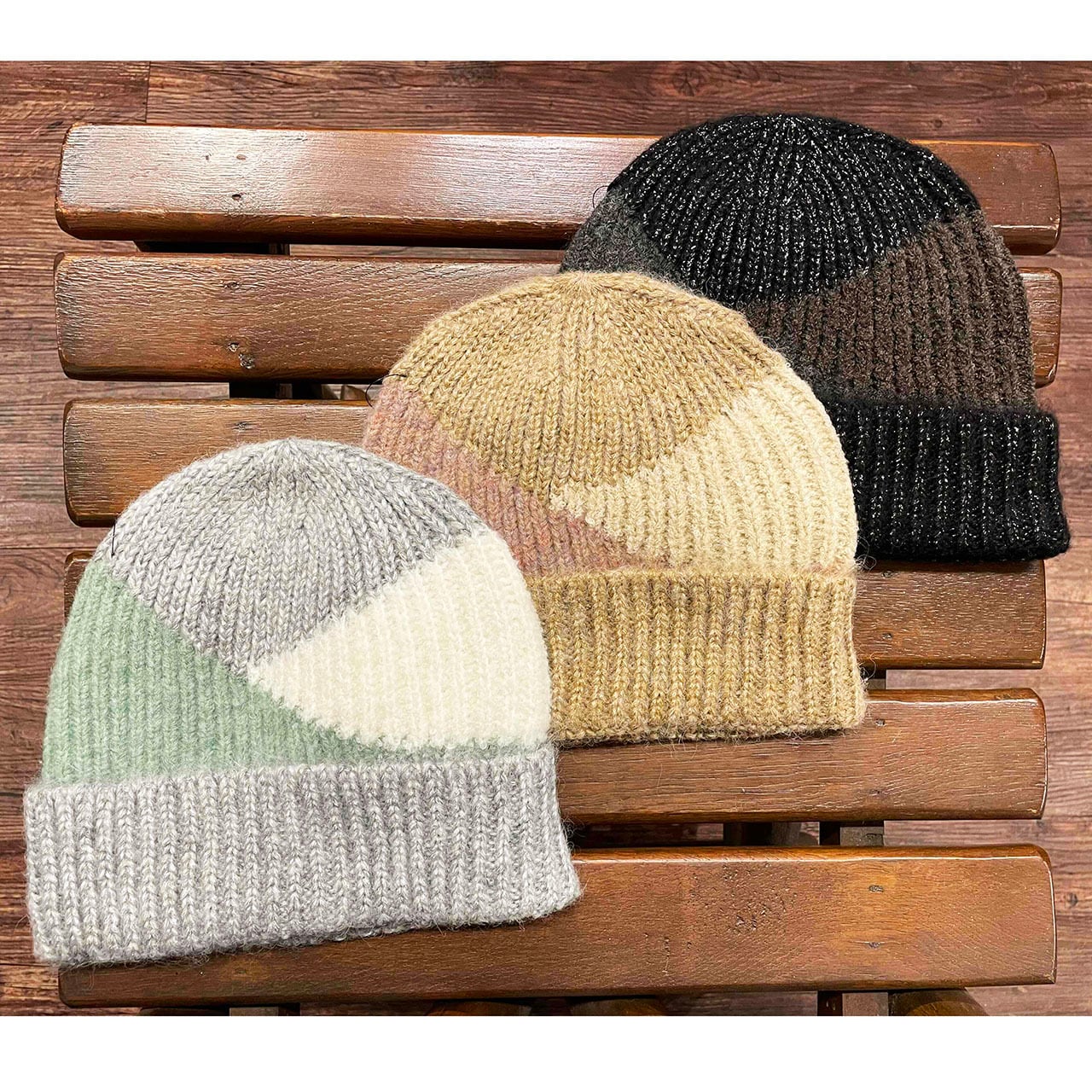 3種類の糸を使用したニット折り返し帽。