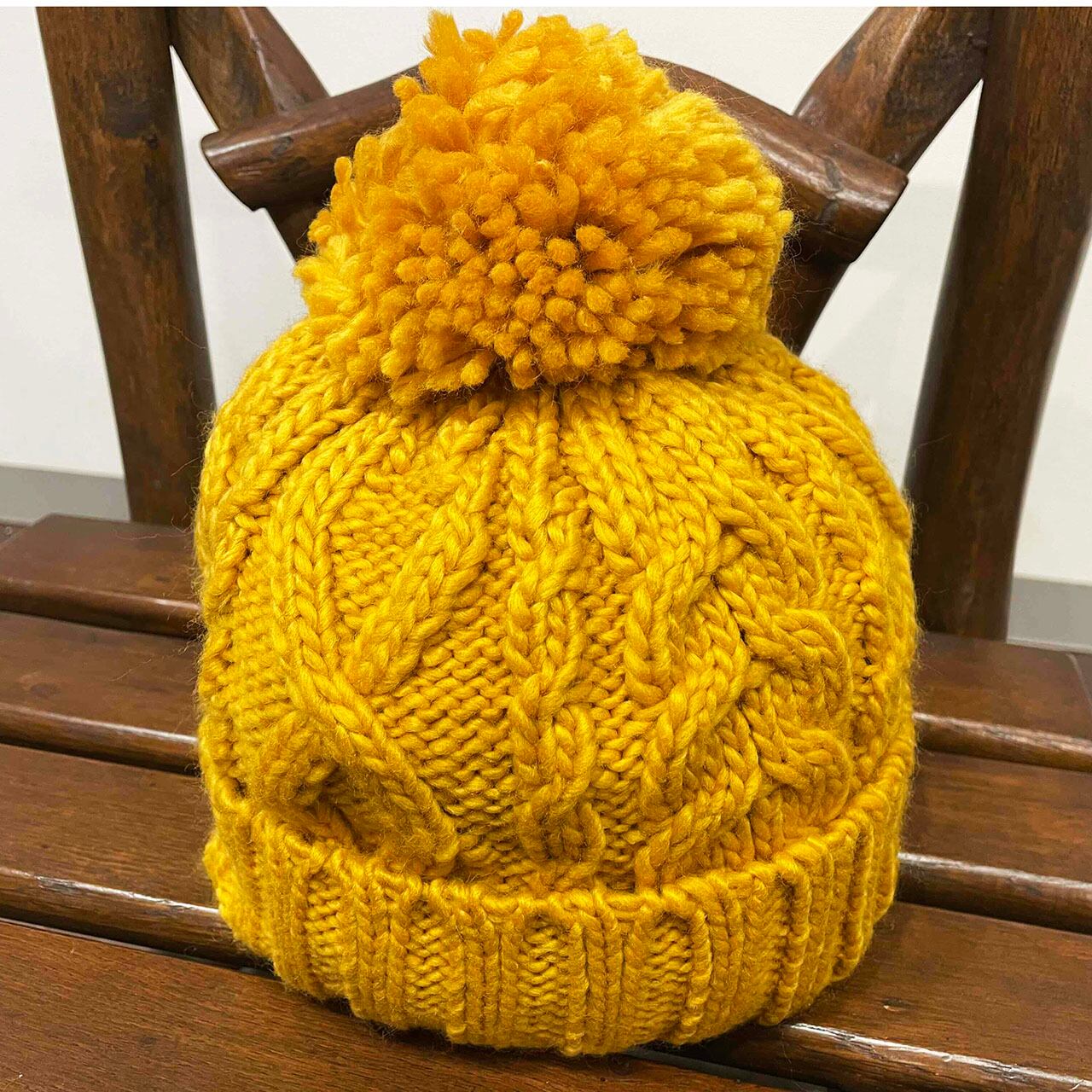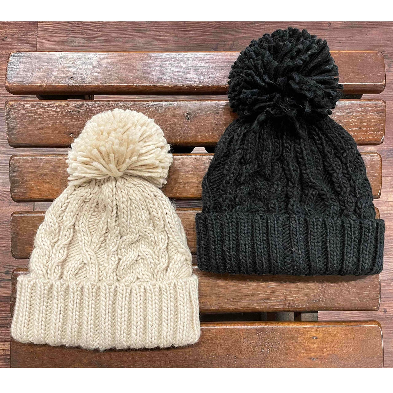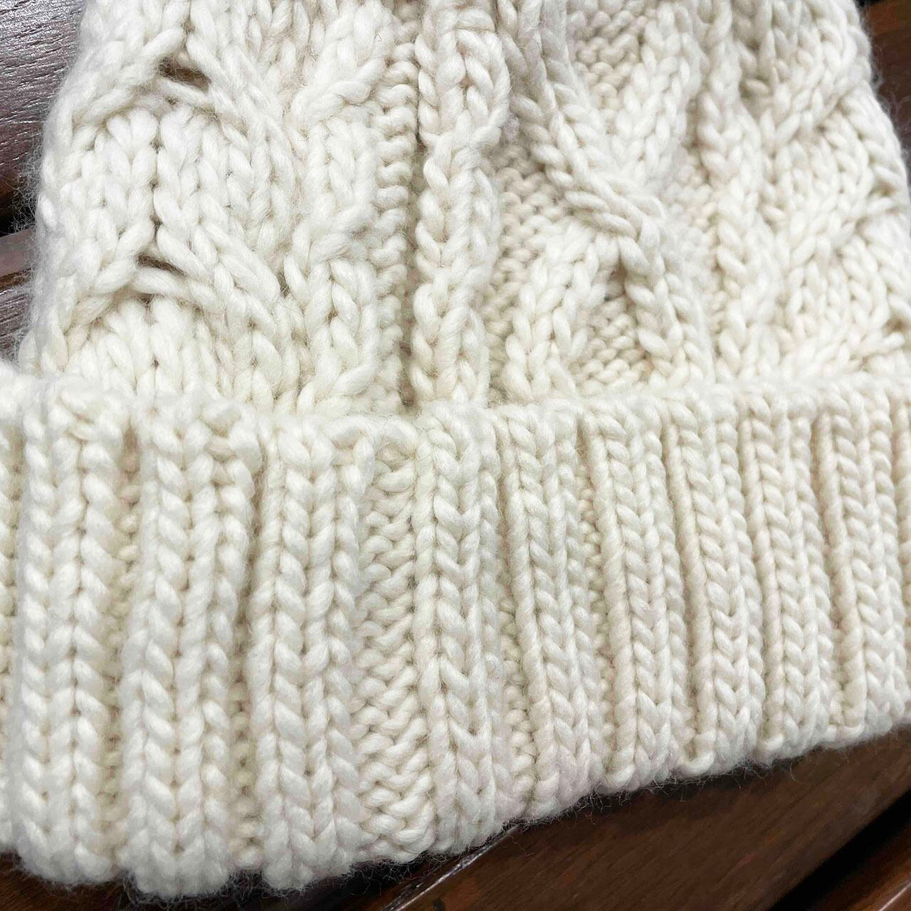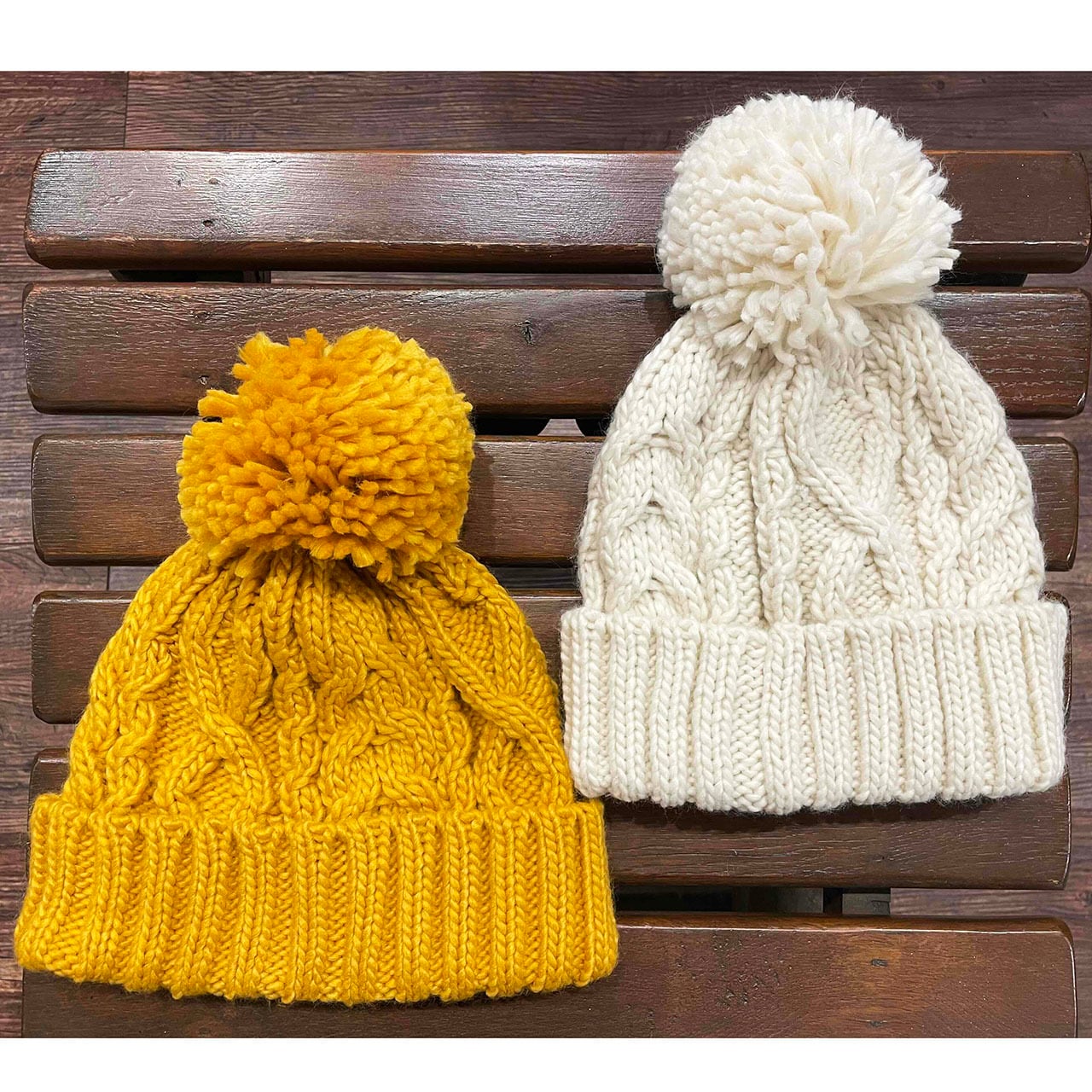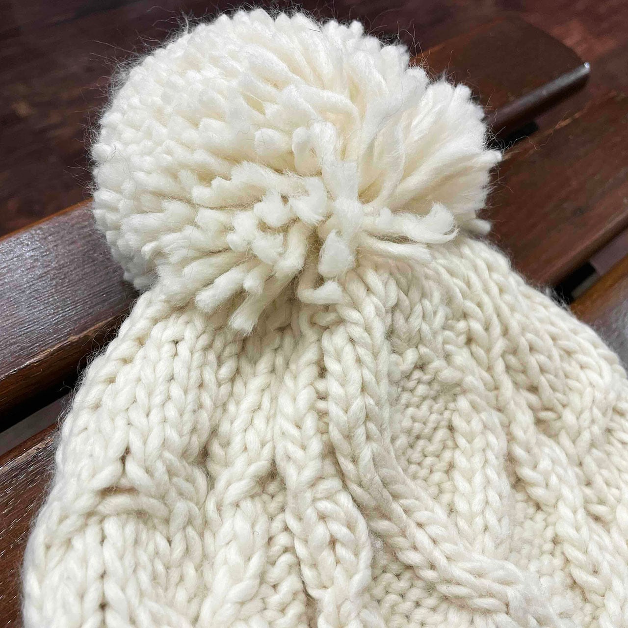 大きめボンボンがかわいいざっくり編みのケーブルニット帽です。