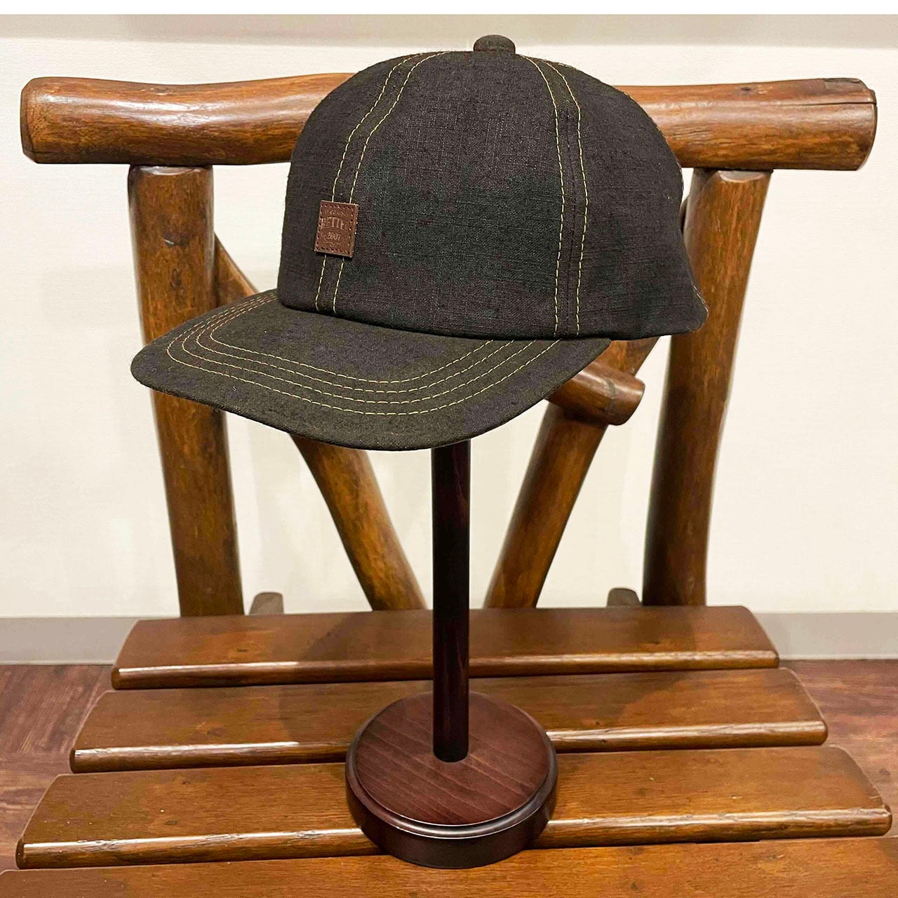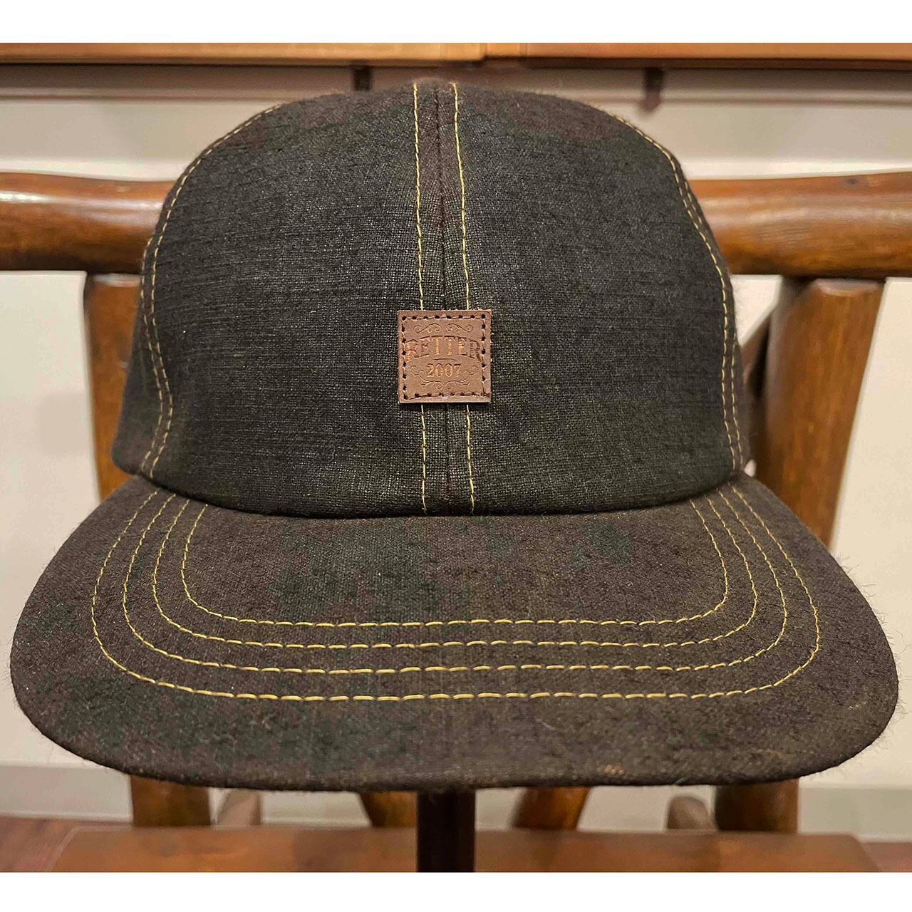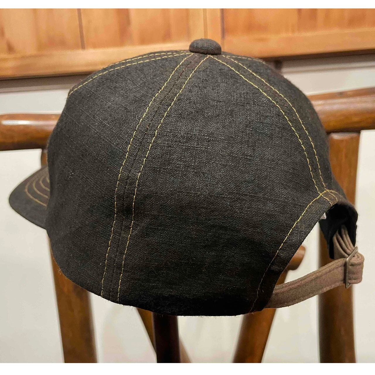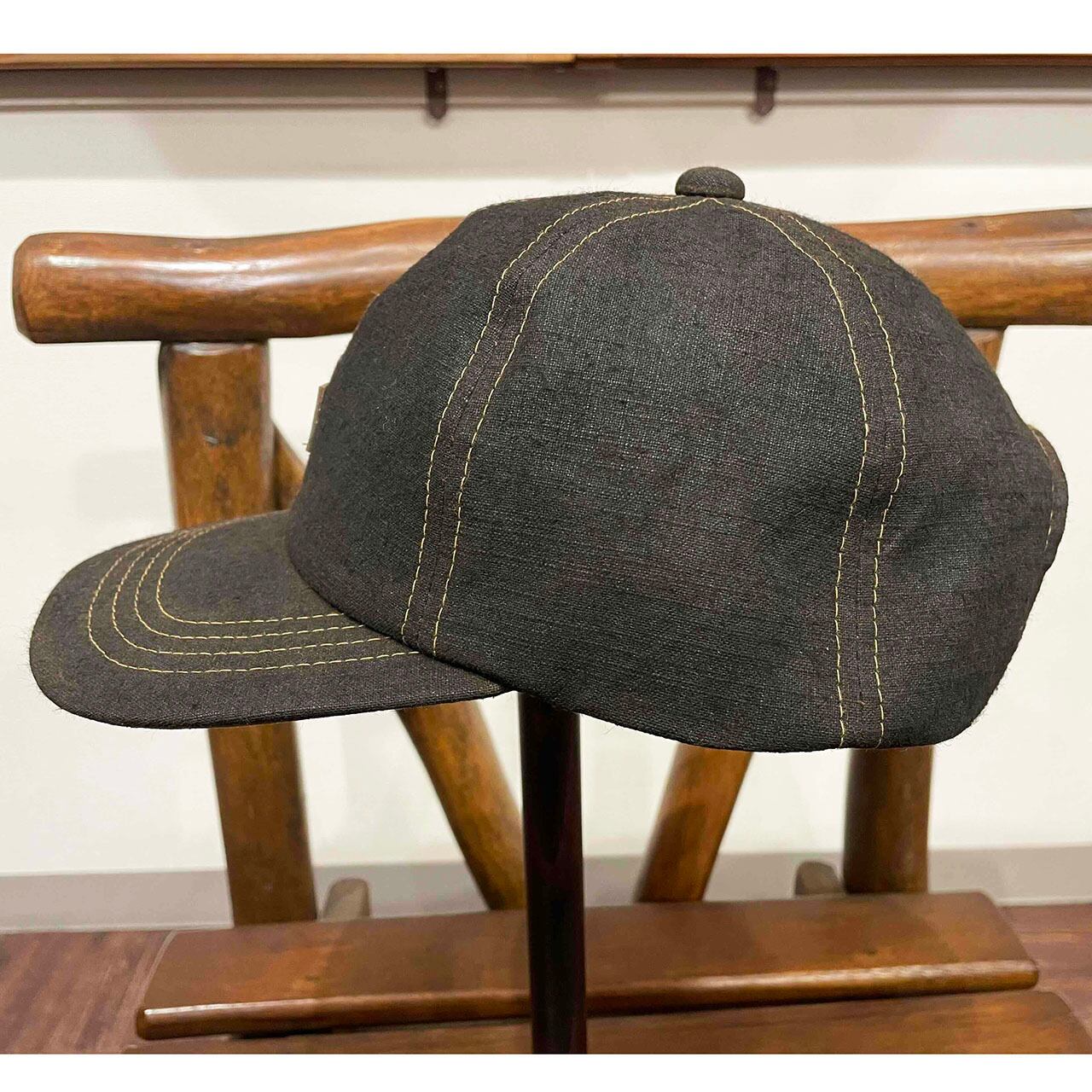 自然の力のみで染色(泥染)したムラ糸綿帆布生地のベースボールキャップ。